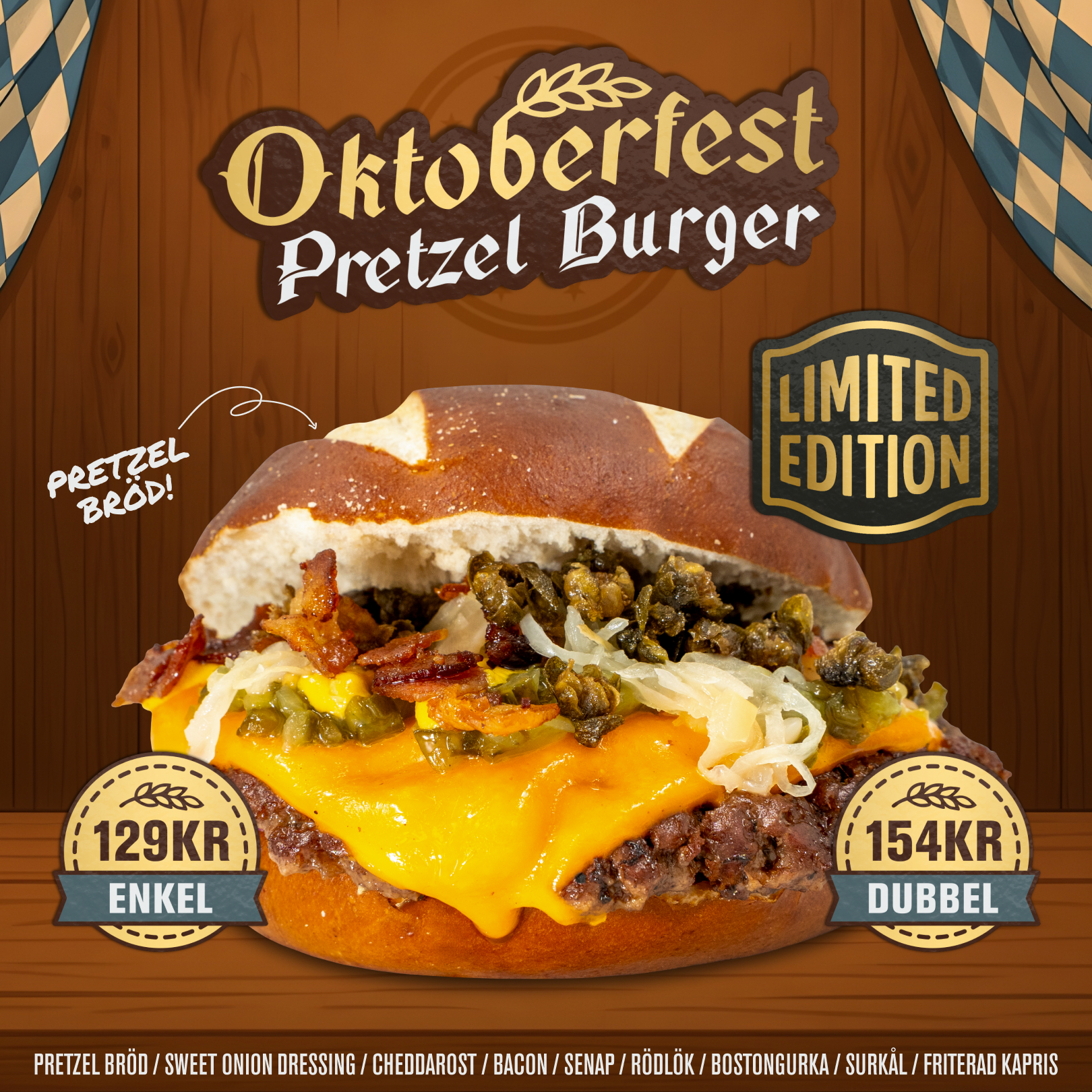 Under hela oktober kan du värma dig i höstmörkret med vår Limited Edition: 🥨Pretzel Burger — en smakrik gäst på menyn. Pretzel bröd, kött, cheddarost, bacon och sweet onion dressing möter senap, bostongurka, surkål, friterad kapris och rödlök — en tysk höstklassiker i burgarformat. 👉Tillgänglig 22/9–2/11