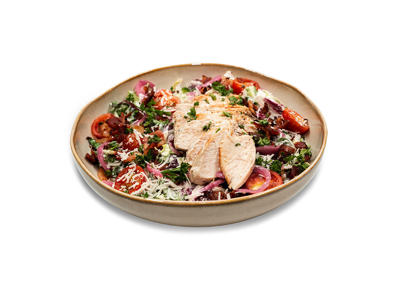 Kycklingfilé / provencesallad / aioli / cocktailtomater / bacon / picklad rödlök / parmesan / persilja / svartpeppar